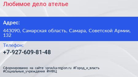 Любимое дело, ателье по адресу 443090, Самарская область, Самара, Советской Армии, 132 в дальнейшем Организация, размещена в следующих категориях: