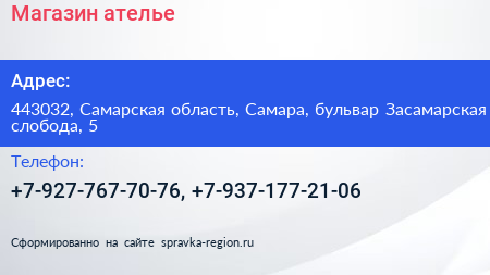 Магазин-ателье по адресу 443032, Самарская область, Самара, бульвар Засамарская слобода, 5 в дальнейшем Организация, размещена в следующих категориях: