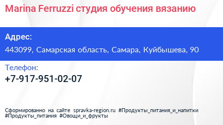 Marina Ferruzzi, студия обучения вязанию по адресу 443099, Самарская область, Самара, Куйбышева, 90 в дальнейшем Организация, размещена в следующих категориях: