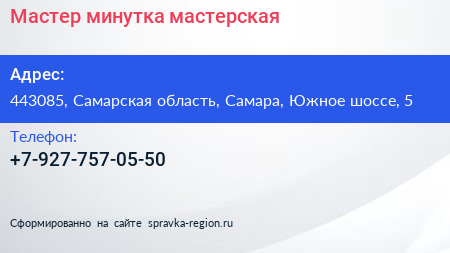 Мастер минутка, мастерская по адресу 443085, Самарская область, Самара, Южное шоссе, 5 в дальнейшем Организация, размещена в следующих категориях: