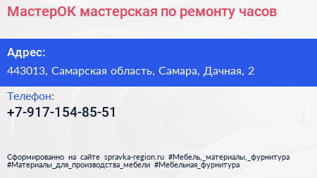 МастерОК, мастерская по ремонту часов по адресу 443013, Самарская область, Самара, Дачная, 2 в дальнейшем Организация, размещена в следующих категориях: