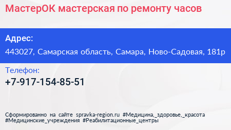 МастерОК, мастерская по ремонту часов по адресу 443027, Самарская область, Самара, Ново-Садовая, 181р в дальнейшем Организация, размещена в следующих категориях: