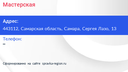 Мастерская по адресу 443112, Самарская область, Самара, Сергея Лазо, 13 в дальнейшем Организация, размещена в следующих категориях: