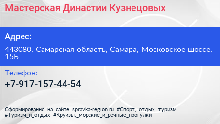 Мастерская Династии Кузнецовых по адресу 443080, Самарская область, Самара, Московское шоссе, 15Б в дальнейшем Организация, размещена в следующих категориях: