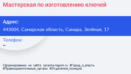 Мастерская по изготовлению ключей по адресу 443004, Самарская область, Самара, Зелёная, 17 в дальнейшем Организация, размещена в следующих категориях: