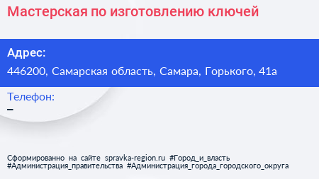 Мастерская по изготовлению ключей по адресу 446200, Самарская область, Самара, Горького, 41а в дальнейшем Организация, размещена в следующих категориях: