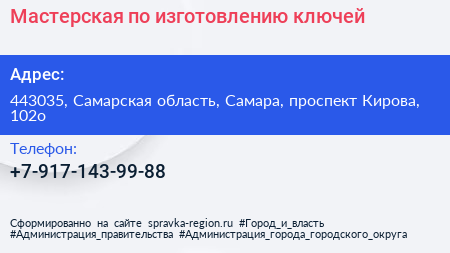 Мастерская по изготовлению ключей по адресу 443035, Самарская область, Самара, проспект Кирова, 102о в дальнейшем Организация, размещена в следующих категориях: