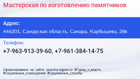 Мастерская по изготовлению памятников по адресу 446201, Самарская область, Самара, Карбышева, 28в в дальнейшем Организация, размещена в следующих категориях: