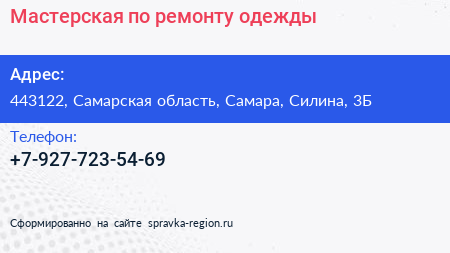 Мастерская по ремонту одежды по адресу 443122, Самарская область, Самара, Силина, 3Б в дальнейшем Организация, размещена в следующих категориях: