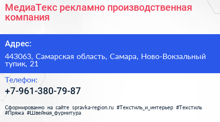 МедиаТекс, рекламно-производственная компания по адресу 443063, Самарская область, Самара, Ново-Вокзальный тупик, 21 в дальнейшем Организация, размещена в следующих категориях: