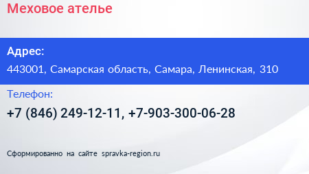 Меховое ателье по адресу 443001, Самарская область, Самара, Ленинская, 310 в дальнейшем Организация, размещена в следующих категориях: