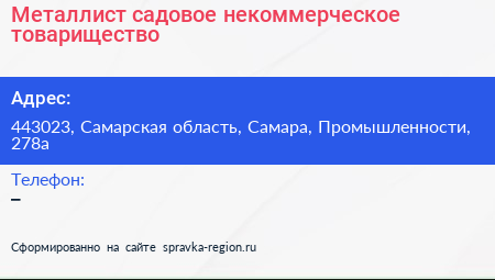 Металлист, садовое некоммерческое товарищество по адресу 443023, Самарская область, Самара, Промышленности, 278а в дальнейшем Организация, размещена в следующих категориях: