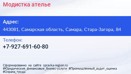 Модистка, ателье по адресу 443081, Самарская область, Самара, Стара-Загора, 84 в дальнейшем Организация, размещена в следующих категориях: