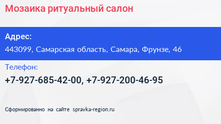 Мозаика, ритуальный салон по адресу 443099, Самарская область, Самара, Фрунзе, 46 в дальнейшем Организация, размещена в следующих категориях: