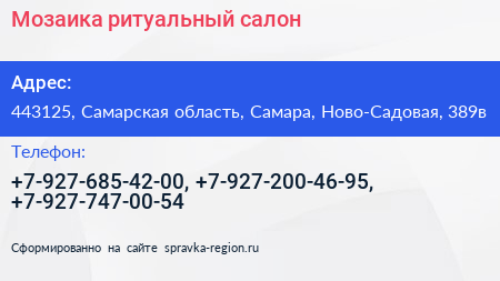 Мозаика, ритуальный салон по адресу 443125, Самарская область, Самара, Ново-Садовая, 389в в дальнейшем Организация, размещена в следующих категориях: