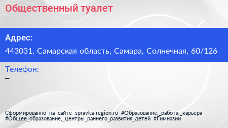 Общественный туалет по адресу 443031, Самарская область, Самара, Солнечная, 60/126 в дальнейшем Организация, размещена в следующих категориях: