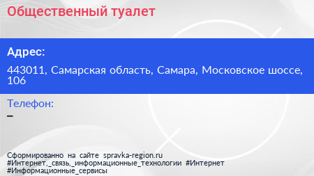 Общественный туалет по адресу 443011, Самарская область, Самара, Московское шоссе, 106 в дальнейшем Организация, размещена в следующих категориях: