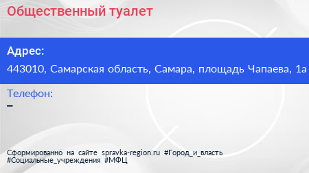 Общественный туалет по адресу 443010, Самарская область, Самара, площадь Чапаева, 1а в дальнейшем Организация, размещена в следующих категориях: