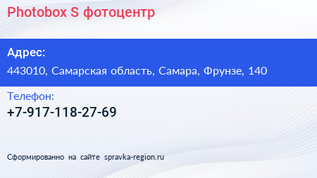 Photobox S, фотоцентр по адресу 443010, Самарская область, Самара, Фрунзе, 140 в дальнейшем Организация, размещена в следующих категориях: