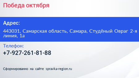 Победа октября по адресу 443031, Самарская область, Самара, Студёный Овраг 2-я линия, 1а в дальнейшем Организация, размещена в следующих категориях: