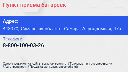 Пункт приема батареек по адресу 443070, Самарская область, Самара, Аэродромная, 47а в дальнейшем Организация, размещена в следующих категориях: