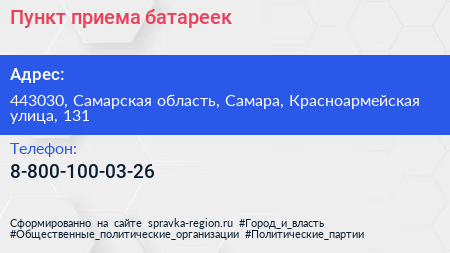 Пункт приема батареек по адресу 443030, Самарская область, Самара, Красноармейская улица, 131 в дальнейшем Организация, размещена в следующих категориях: