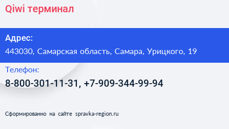 Qiwi, терминал по адресу 443030, Самарская область, Самара, Урицкого, 19 в дальнейшем Организация, размещена в следующих категориях: