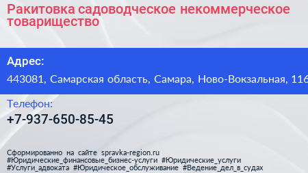 Ракитовка, садоводческое некоммерческое товарищество по адресу 443081, Самарская область, Самара, Ново-Вокзальная, 116 в дальнейшем Организация, размещена в следующих категориях: