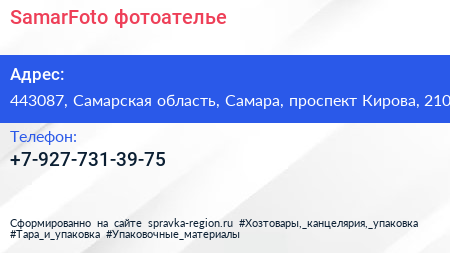 SamarFoto, фотоателье по адресу 443087, Самарская область, Самара, проспект Кирова, 210 в дальнейшем Организация, размещена в следующих категориях: