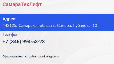 СамараТехЛифт по адресу 443125, Самарская область, Самара, Губанова, 10 в дальнейшем Организация, размещена в следующих категориях: