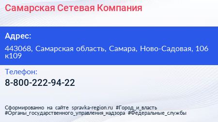 Самарская Сетевая Компания по адресу 443068, Самарская область, Самара, Ново-Садовая, 106 к109 в дальнейшем Организация, размещена в следующих категориях: