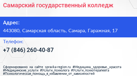 Самарский государственный колледж по адресу 443080, Самарская область, Самара, Гаражная, 17 в дальнейшем Организация, размещена в следующих категориях: