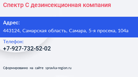 Спектр-С, дезинсекционная компания по адресу 443124, Самарская область, Самара, 5-я просека, 104а в дальнейшем Организация, размещена в следующих категориях: