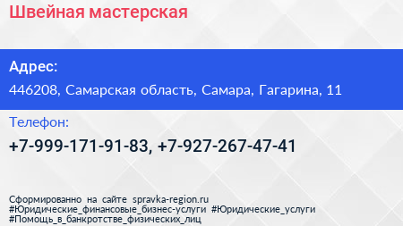Швейная мастерская по адресу 446208, Самарская область, Самара, Гагарина, 11 в дальнейшем Организация, размещена в следующих категориях: