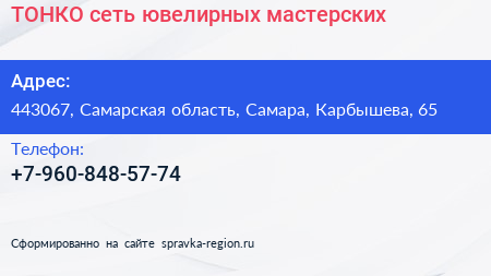 ТОНКО, сеть ювелирных мастерских по адресу 443067, Самарская область, Самара, Карбышева, 65 в дальнейшем Организация, размещена в следующих категориях: