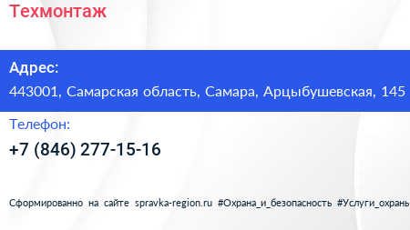 Техмонтаж по адресу 443001, Самарская область, Самара, Арцыбушевская, 145 в дальнейшем Организация, размещена в следующих категориях: