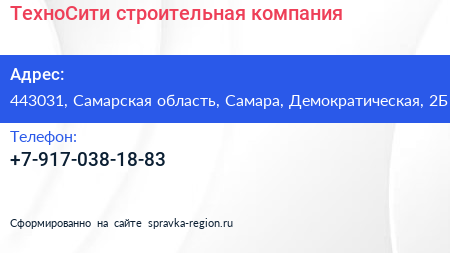 ТехноСити, строительная компания по адресу 443031, Самарская область, Самара, Демократическая, 2Б в дальнейшем Организация, размещена в следующих категориях: