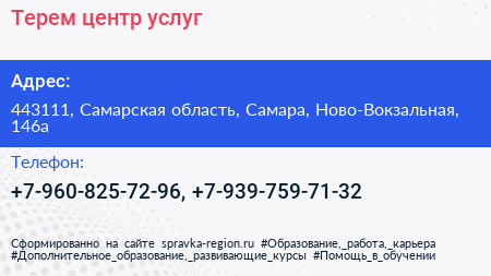 Терем, центр услуг по адресу 443111, Самарская область, Самара, Ново-Вокзальная, 146а в дальнейшем Организация, размещена в следующих категориях: