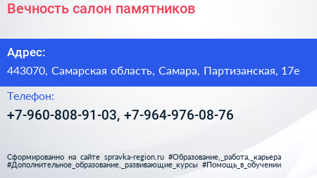 Вечность, салон памятников по адресу 443070, Самарская область, Самара, Партизанская, 17е в дальнейшем Организация, размещена в следующих категориях: