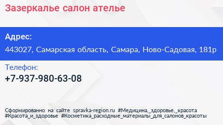 Зазеркалье, салон-ателье по адресу 443027, Самарская область, Самара, Ново-Садовая, 181р в дальнейшем Организация, размещена в следующих категориях: