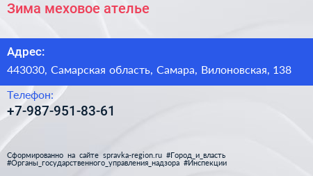 Зима, меховое ателье по адресу 443030, Самарская область, Самара, Вилоновская, 138 в дальнейшем Организация, размещена в следующих категориях:
