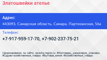 Златошвейки, ателье по адресу 443093, Самарская область, Самара, Партизанская, 56а в дальнейшем Организация, размещена в следующих категориях: