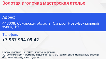 Золотая иголочка, мастерская-ателье по адресу 443008, Самарская область, Самара, Ново-Вокзальный тупик, 10 в дальнейшем Организация, размещена в следующих категориях: