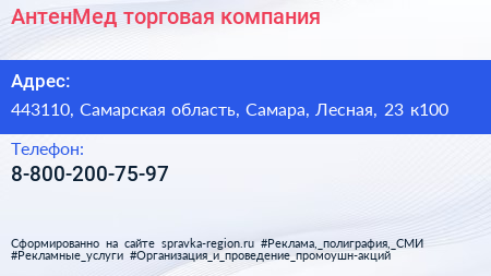 АнтенМед, торговая компания по адресу 443110, Самарская область, Самара, Лесная, 23 к100 в дальнейшем Организация, размещена в следующих категориях:
