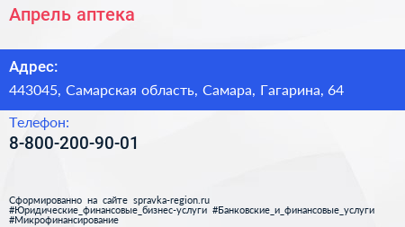 Апрель, аптека по адресу 443045, Самарская область, Самара, Гагарина, 64 в дальнейшем Организация, размещена в следующих категориях: