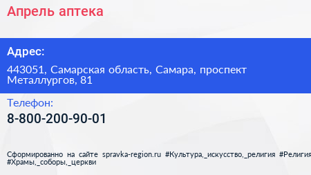 Апрель, аптека по адресу 443051, Самарская область, Самара, проспект Металлургов, 81 в дальнейшем Организация, размещена в следующих категориях: