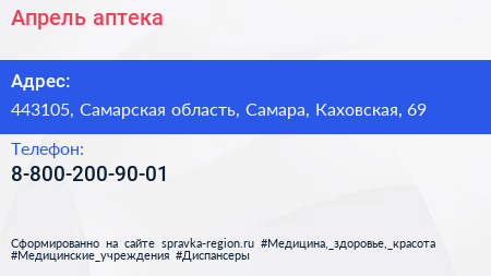 Апрель, аптека по адресу 443105, Самарская область, Самара, Каховская, 69 в дальнейшем Организация, размещена в следующих категориях: