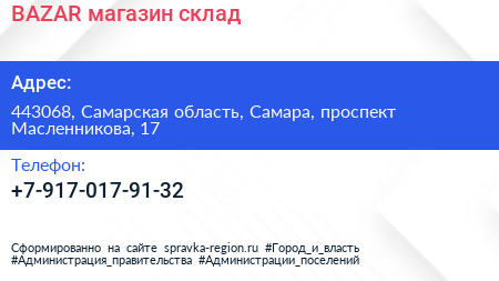 BAZAR, магазин-склад по адресу 443068, Самарская область, Самара, проспект Масленникова, 17 в дальнейшем Организация, размещена в следующих категориях: