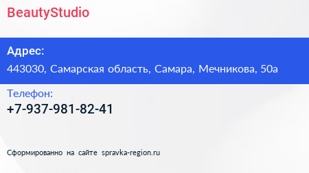 BeautyStudio по адресу 443030, Самарская область, Самара, Мечникова, 50а в дальнейшем Организация, размещена в следующих категориях: