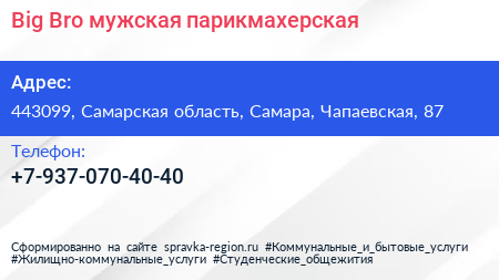 Big Bro, мужская парикмахерская по адресу 443099, Самарская область, Самара, Чапаевская, 87 в дальнейшем Организация, размещена в следующих категориях: